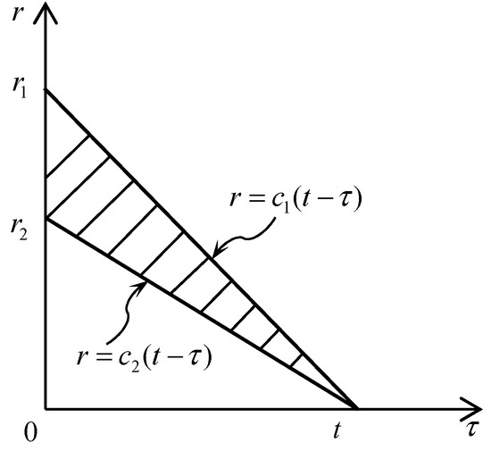 The paper in [16] defines the Analytically Time-Integrable Temporal–Spatial Domain (ATI-TSD), as shown in Figure 1. The wavefront singularity coefficients can be expressed analytically in time within this temporal–spatial domain. The principle is based on the propagation distances of P-waves and S-waves and the distance r between the source point and the field point, which together form the shaded triangular region in the figure. The horizontal axis, τ, represents the time of pulse action, while the vertical axis, r, represents the distance from the field point to the source point. The origin o of the coordinate system corresponds to the initial time t = 0. The oblique line segment above represents , indicating the farthest distance that the P-wave can propagate at time t. The region above this oblique line (i.e., ) represents the area where the wave has not yet propagated, and in this region, , , , and ; the region below the oblique line segment (i.e., ) indicates the area where the P-wave has already propagated, and in this region, . The Dirac function and its derivatives can also be obtained analytically. The lower oblique line segment, denoted as , represents the farthest distance that the S-wave can propagate at instant t. The region above this oblique line (i.e., ) corresponds to the area where the S-wave has not yet propagated, and here, , , , and ; below this oblique line, the region (i.e., ) indicates where the S-wave has already propagated, and in this case, . Similarly, the Dirac function and its derivatives can be obtained analytically. Therefore, the wavefront singularity coefficients can be analytically solved in time only when the region lies between the two oblique lines, as shown in the shaded area of the figure.