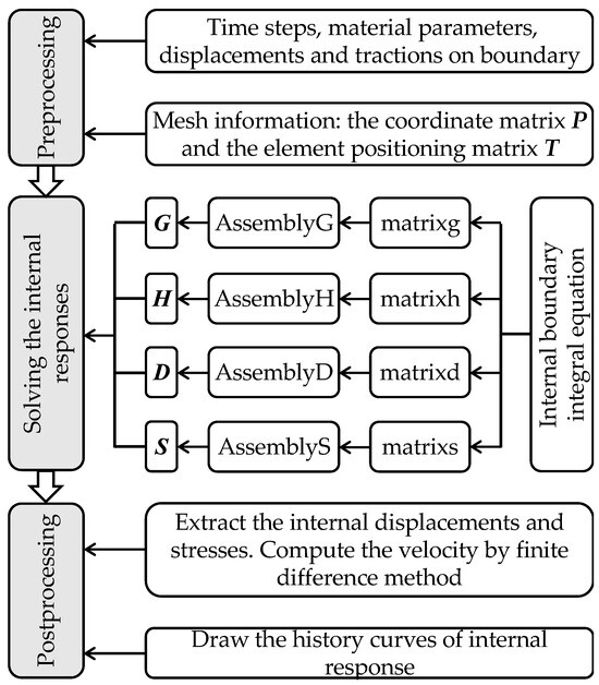 Solving the internal responses: The boundary integral equations are discretized to form the element influence coefficients g, h, d, and s, which are computed using matrixg, matrixh, matrixd, and matrixs, respectively. Wavefront singularities are eliminated through an analytical approach. The computed element influence coefficients are then assembled into the global influence coefficient matrices G, H, D, and S using AssemblyG, AssemblyH, AssemblyD, and AssemblyS. These global matrices are substituted into Equations (29) and (30) to obtain the displacements and stresses at internal points.