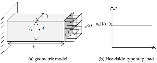 The one-dimensional rod example is a classic benchmark for validating the TD-BEM algorithm. Here, a one-dimensional rod subjected to a Heaviside-type step load is selected. Its geometric model is shown in Figure 4a, with a length l1 = 4 m and both width l2 and height l3 equal to 1 m. The left end of the rod is fixed, while the right end is subjected to a Heaviside load , where the loading curve is illustrated in Figure 4b. The rod is characterized by elastic modulus , Poisson’s ratio , and material density .