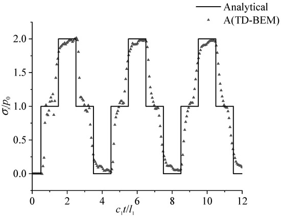 The calculation points are selected as A (l1/2, l2/2, l3/2). The internal stress results obtained using the TD-BEM algorithm are compared with the existing analytical solutions. Calculations were performed for three periods. Both the horizontal and vertical coordinates were dimensionless. The vertical coordinate was scaled by multiplying by , and the horizontal coordinate was scaled by multiplying by , where represents the applied load, is the longitudinal wave speed, and is the length of the rod.