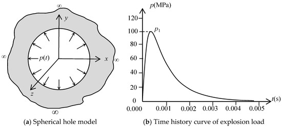 The computational model comprises a spherical cavity in an infinite, homogeneous, and isotropic elastic medium. The inner radius of the cavity is r0 = 1 m. A spherical explosion load is applied along the cavity, and the expression for the explosion load is (k = 1.435, a = 1279 s−1, b = 12,792 s−1, p1 = 100 MPa); the time history curve is shown in Figure 8b. Poisson’s ratio ν here is set to 0.3