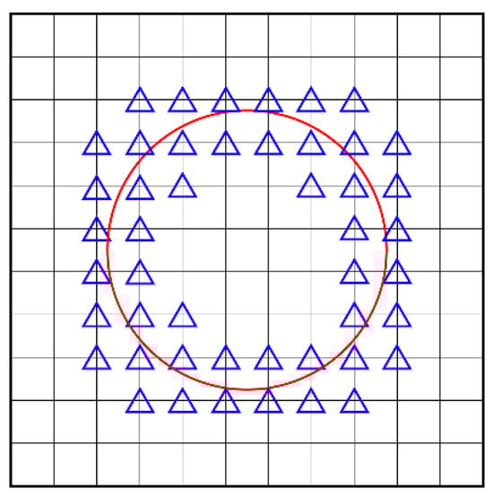 The XFEM enrichment scheme for one circular inclusion (red line) within the domain. Nodes marked with blue triangulars are enriched by .