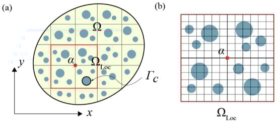 For a local problem, an auxiliary local problem is built by selecting all coarse FE elements sharing the vertex node , which compose a local domain (Figure 2). By subdividing each macro-element into micro-elements, a nested mesh is generated for the local problem. The micro-element size shall be sufficiently small to describe the geometry of inclusions or voids. In practice, the element size is typically set to one-fifth of the inclusion diameter. If the element size is too large, the geometric features of the inclusion or void cannot be accurately captured, thereby compromising integration precision. Conversely, excessively small element sizes lead to prohibitively high computational costs. For local problems, the XFEM is employed to model micro-discontinuities on a fine mesh. The boundary condition for the local problem is applied by the use of the coarse solution on corresponding micro-nodes. If one lets denote the XFEM solution of the local problem, it will be used as the global–local enrichment function. The global shape functions incorporated with the local solution can build a PoU.