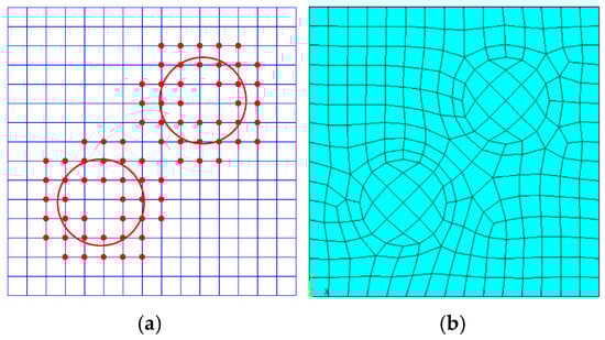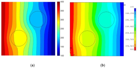 To validate the XFEM for a temperature field, a square plate containing two circular inclusions was numerically simulated by the XFEM and FEM, and the obtained results were compared. The size of the plate was 10 × 10 m, and the radius of each inclusion was 1.5 m. The configuration of two inclusions is visible in the XFEM and FEM mesh shown in Figure 5. The temperatures of the left and right edges were set to be 400 and 100 °C, respectively, and the top and bottom edges were kept as adiabatic surfaces. The thermal conductivity coefficient of the inclusions and matrix were set as 1000 and 100 kJ/(m·h·°C), respectively.