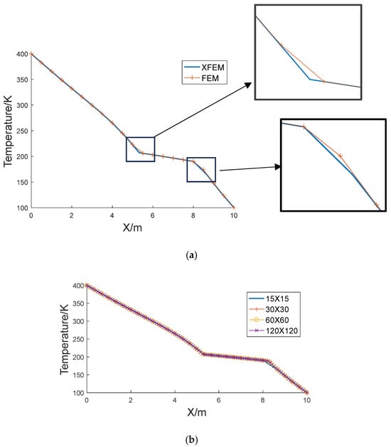 Contour plots of temperature results by the two methods are presented in Figure 6. In order to compare the results of the two methods, the temperature variation curves along y = 6.66667 m (the center of the upper inclusion) are plotted in Figure 7a. With a coarse mesh in the XFEM, only a minimal difference can be found around the interfaces between the matrix and inclusion. The mesh resolution was investigated by using four different meshes that consist of 15 × 15, 30 × 30, 60 × 60, and 120 × 120 elements, respectively. The temperature distribution at y = 6.66667 m produced by these meshes is plotted in Figure 7b. It indicates that mesh refinement had a minimal effect on the XFEM results; even the coarsest mesh produced an accurate result. At its smallest, the element size should be sufficiently small to describe the geometry of heterogeneities.