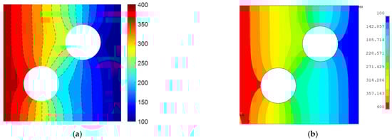 To simulate the plate with voids, the second method was employed to showcase the effectiveness of XFEM. For this case, the contour plots of the temperature fields obtained from the XFEM and FEM are depicted in Figure 8 for comparison; these fields have favorable agreement.