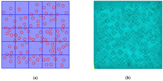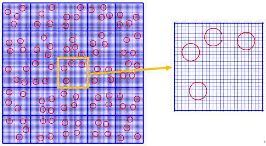 An RVE containing randomly distributed inclusions was simulated using the proposed multiscale method to demonstrate the effectiveness of the proposed multiscale approach. An RVE should be properly configured to effectively reflect the material microstructure; that is, both the domain size and number of inclusions should be adequate. The considered RVE was discretized with a 5 × 5 grid of macro-elements, and each macro-element contained four randomly distributed non-overlapping inclusions. Therefore, the RVE had a total of 100 inclusions; the configuration of the RVE and two scale meshes are shown in Figure 9. Each macro-element was further discretized into a 25 × 25 grid of micro-elements.