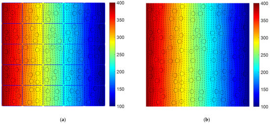 In order to remove the constraint that inclusions are contained within macro-elements, which means the interfaces of inclusions may intersect with the macro-elements’ boundaries, additional programming effort is required to identify and include those inclusions that intersect with macro-element boundaries when calculating the level set function values at all micro-nodes. Contour plots of the temperature field are provided in Figure 16, in which the range [100 400] is divided into 25 uniform contour levels. A good agreement can be found between the temperature results. Even when the enrichments are located on the boundaries of macro-elements, the temperature result is continuous over the entire domain.