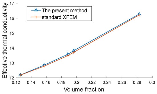 where and are the thermal conductivities of the inclusions and matrix, respectively. The ETC values obtained using the proposed GFEMgl are in good agreement with those obtained using the standard XFEM. As expected, the numerical results lie between the upper and lower bounds of the P–S model but closer to the P bound, which is known to provide a better estimation of the ETC than does the S bound. The variation in the ETC with the volume fraction of inclusions is plotted in Figure 12. As expected, this relation was slightly nonlinear.