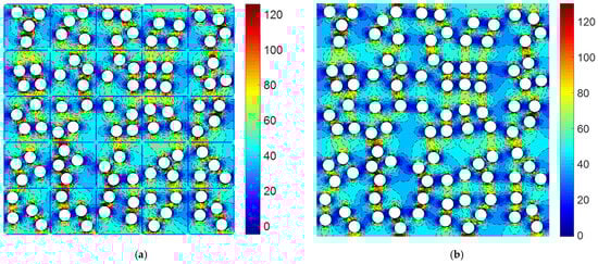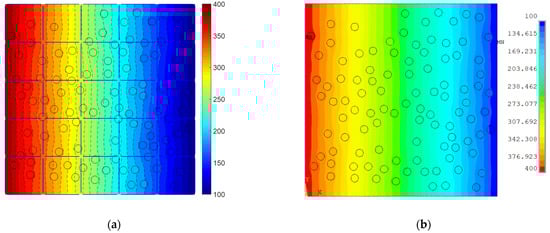 The RVE size was set as 50 × 50 m2, and all inclusions had a uniform radius of R = 1 m. The volume fraction of inclusions in this configuration was therefore 12.95%. The thermal conductivity coefficients of the matrix and inclusions were set as 10 and 100 kJ/(m·h·°C), respectively. Moreover, the temperatures of the left and right edges were set as 400 and 100 °C, respectively, and the top and bottom edges were set as adiabatic surfaces.