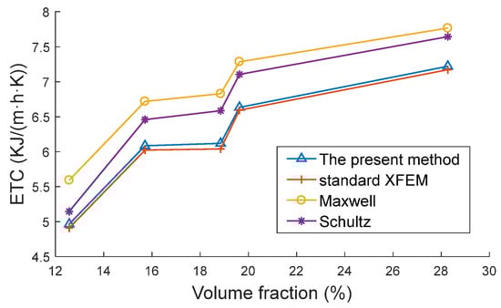 To investigate the influence of the volume fraction of inclusions on the ETC, detailed thermal conduction analyses were carried out first on an RVE. For all configurations considered in this subsection, a constant temperature of 400 and 100 °C were set for the left and right edges, respectively, and the other two edges were kept adiabatic. The same RVE and thermal properties described in Section 4.2 were also employed for the computations conducted in this subsection. The effective heat flux of the composites along the direction of heat transfer can be calculated by the integration over the entire domain. The ETC in the x-direction can thus be calculated based on Fourier’s law as follows: