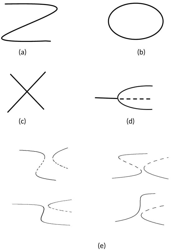 We start by carrying out a steady-state analysis of the system. The steady-states equations of the model were conveniently reduced to a single nonlinear equation in T (Equation (11)). The singularity theory can therefore be readily applied to analyze the system. The chemotherapy dose is the most convenient parameter to vary and is selected as the main bifurcation parameter. The steady-state equation (Equation (11)) is cubic in T. Within the framework of this equation, singularity theory delineates two forms of codimension-one singularities: hysteresis, which describes the development of an isola that consists of a closed locus of a solution branch bordered by two fold points, and the evolution of this isola into mushroom singularities. Additionally, a pitchfork singularity, recognized as codimension two, is defined for a cubic single-scalar function. The fundamental singularities are depicted in Figure 1a–d. It is essential to note that even minor variations in model parameters can lead to the disintegration of the perfect pitchfork, resulting in the appearance of four additional bifurcation patterns, as illustrated in Figure 1e.