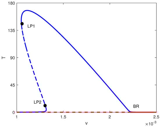 In region (2) of the branch set of Figure 2, two static limit points are born as a result of crossing the hysteresis line. An example of a bifurcation diagram is shown in Figure 4 for . Two static limit points and occur at and , respectively. The following regimes are therefore expected: For v smaller than , the system settles on the low-concentration tumor cells (the trivial solution is unstable). Between and , there is bistability where the system can settle on low-tumor cells, but any changes in the initial conditions/external stimulations can push the system to sneak to a higher tumor concentration despite the administration of the drug. As the value of v increases beyond , the tumor cell concentration decreases with the drug intensity. Values of v larger than the lead to suppression of the tumor.