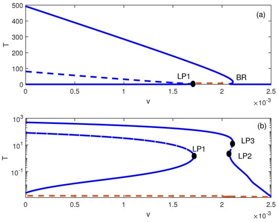Bifurcation diagram for region (3) of Figure 2 for : (a) diagram in linear scale; (b) diagram in semi-logarithmic scale (in T); solid line (stable branch); dashed line (unstable branch); BR (bifurcation point); LP1, LP2, and LP3 limit points; blue color is nontrivial steady state; red color is trivial steady state .