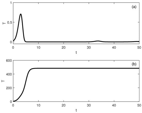 Simulations illustrating bistability in Figure 5, for example, for . (a) Initial conditions lead to low-tumor steady state. (b) Initial conditions lead to the high-tumor steady state.