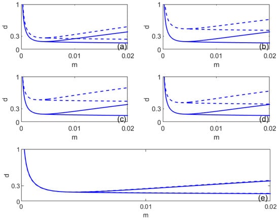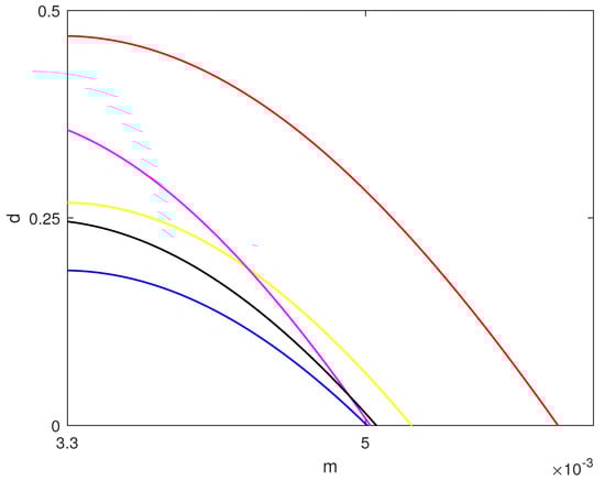 Finally, we saw in all the aforementioned bifurcation diagrams that if the drug intensity is increased past a critical point solution of (Equation (15)), the tumor is completely suppressed. Figure 13 shows the effect of the different model parameters on the critical value . It can be seen that as s is increased, decreases, while the opposite can be seen for d. As increases, increases, while has the opposite effect and is more pronounced. The value of is independent of , g, p, and m.