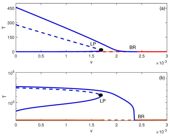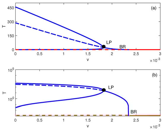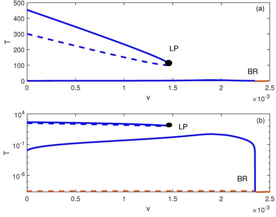 (a) Bifurcation diagram for the model parameters in region (1) of Figure 8. (b) Diagram in semi-logarithmic scale (in T). Solid line (stable branch); dashed line (unstable branch); BR (bifurcation point); LP (limit point); blue color is nontrivial steady state; red color is trivial steady state .