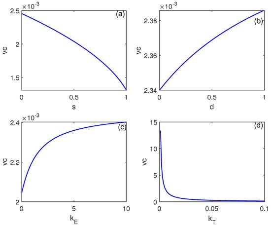 Effect model parameters on the critical value of drug intensity, past of which the tumor is suppressed. (a) Effect of s. (b) Effect of d. (c) Effect of . (d) Effect of .