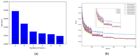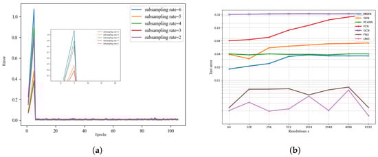 Figure 3 compares the errors as the number of iterations increases when the subsampling rate varies. We can see that when the subsampling rate is 3 and 5, the error is minimized and the algorithm is better than in other cases. It can be seen from the algorithm comparison diagram on the right of Figure 3 and Table 1 that the different algorithms exhibit the ability to solve the partial differential equations in the one-dimensional Burgers equation experiment. The UNO model uses convolution to extract physical feature information. The jump connection reduces the information loss of the model. The results are more accurate than those achieved by other algorithms.