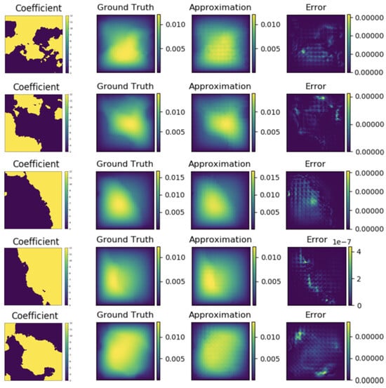 We processed the dataset as follows: first, is a probability measure with zero Neumann boundary conditions on LaPraaca, where and . The external force is fixed to be . The coefficient () was sampled from , and the solution (u) was obtained using the traditional finite element method on the and grids in Matlab. Datasets with different resolutions can be generated by downsampling. We parameterized a two-dimensional Fourier neural operator consisting of four Fourier layers with 20 frequencies per channel and width = 64.