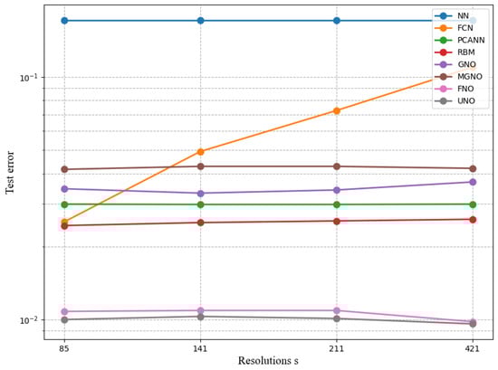 It can be seen from Figure 6 and Table 2 that when different algorithms contrast error maps at resolutions of , , , and , UNO has lower and more stable error loss values compared to the most similar FNO algorithm.