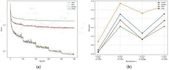 As shown in Figure 8, FNO and UNO achieve the best results. By comparing time and data points, suitable algorithms are selected. The errors of the UNO and FNO algorithms continue to decrease steadily with the number of iterations, with great advantages compared with other models. The error of the UNO algorithm drops faster, with an obvious decreasing process at 100, 200, 300, and 400, showing a continuous jitter decreasing trend, with obvious advantages in solving the equation. The RENET and TFNET models are less effective, and compared with UNO and FNO, the curves are relatively smooth and the errors are larger during iteration. Figure 8 and Table 3 also compares the experimental errors of UNO and FNO, RENET, and TFNET on the dataset. The figure shows N = 10,000 data points and T = 50. When the viscosity coefficient is , the UNO error is the smallest, and UNO has higher accuracy. When the number of data points is N = 1000, UNO is worse than FNO, but when the number of data points increases to N = 10,000, the UNO error is the lowest among the compared algorithms, and 400.