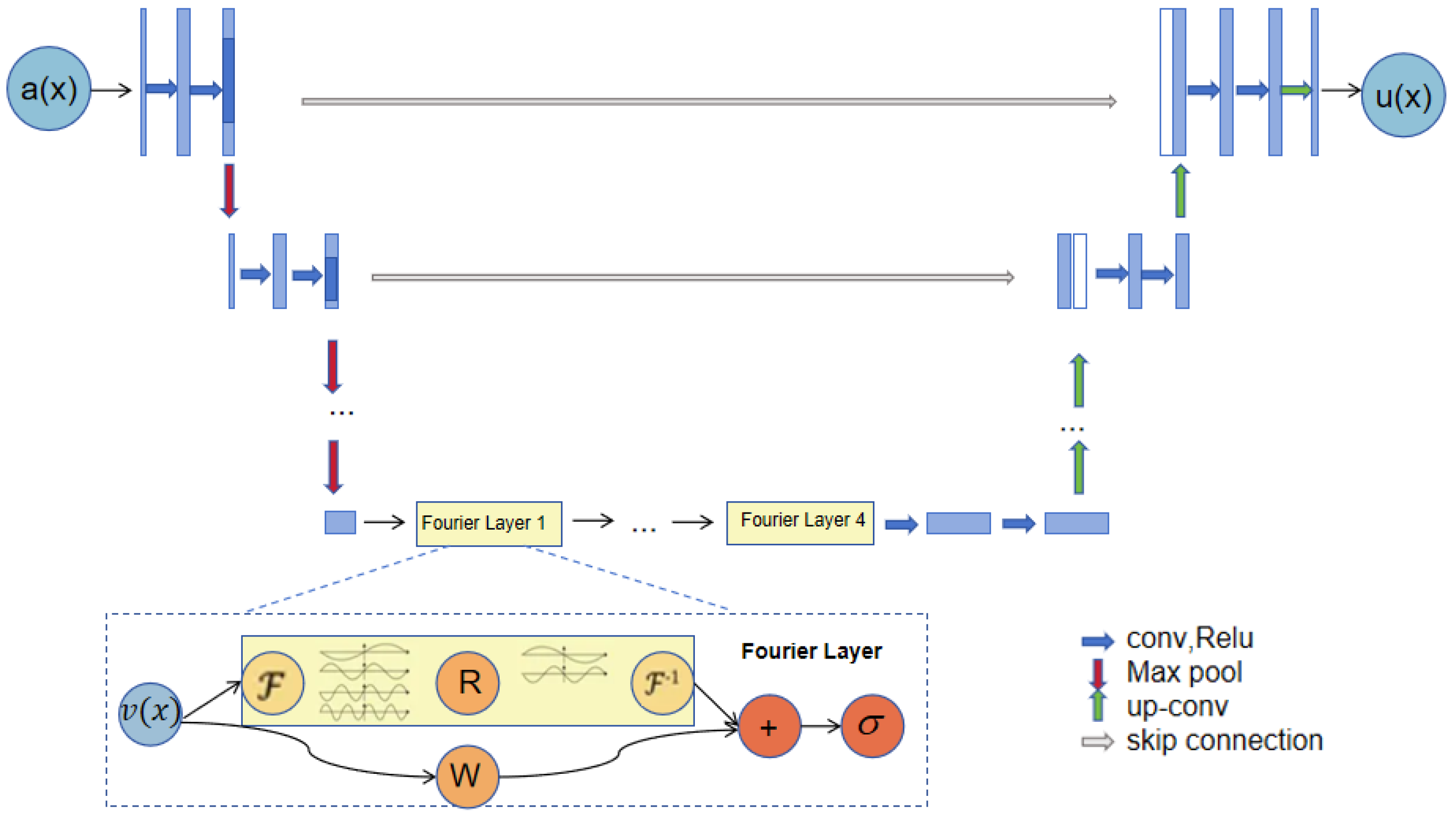 The U-Net neural network, as a classic deep learning architecture, has a unique structure. The first half is mainly responsible for feature extraction, while the second half focuses on the up-sampling operation. This structure is called the encoder–decoder structure. In this study, a Fourier neural operator with adjustable parameters is introduced As shown in the Figure 1. By skillfully integrating the feature information extracted by the U-Net neural network into the Fourier operator, the operational efficiency and solution accuracy of the algorithm can be significantly improved.