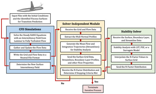 Automated iterative coupling approach for CFD transition modeling using the NASA FUN3D and LASTRAC solvers that can also be substituted with any simulation or stability code based on Hildebrand et al. [30], Venkatachari et al. [29], and Choudhari et al. [2].