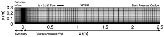 We use a computational grid with 961 and 513 points in the streamwise and wall-normal directions, respectively. The 961 points also include the 257 points upstream of the leading edge of the flat plate. We place the first grid point above the flat plate at a distance of m, which satisfies regardless of the boundary-layer state, and the wall-normal grid spacing increases gradually from there to the freestream. This computational grid is designed to have more than 150 points within the boundary layer. Furthermore, the streamwise grid spacing is the smallest near the leading edge of the flat plate at m. This exact computational grid is depicted as level 6 herein, and others in the family were used in previous work by Venkatachari et al. [39]. For grids in this family, the resolution doubles between consecutive even or odd levels. Grid level 7 has 1441 and 769 points in the streamwise and wall-normal directions, respectively, while grid level 8 has 1921 and 1025 points. Figure 2 displays grid level 1 in this family and the corresponding boundary conditions.