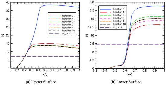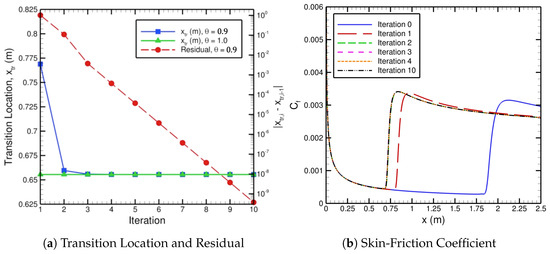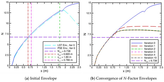 The iterative convergence of the imposed transition location with the corresponding residual and the skin-friction coefficient are displayed in Figure 4. For the initial basic state, i.e., the zeroth iteration, we imposed transition far downstream at m. The skin-friction distribution from the initial basic state is shown in Figure 4b. Once the initial FUN3D basic state has been obtained, it is converted by the solver-independent module to a format that LASTRAC is able to read. That mean flow file is used to determine the N-factor envelope based on PSE computations. The N-factor envelope of the initial basic state is depicted in Figure 5, along with the N-factor envelopes pertaining to iterations 1 through 10. The value of in Figure 5 comes from the expression via Mack [8] for TS waves in 2D flows with . Note that Mack’s correlation of is based on LST results, but, since nonparallel effects for the flat plate are rather small, the same expression may be used for the PSE as well. The location where crosses the N-factor envelope yields , which, in turn, is used to determine the next transition location, , with Equation (7) using and an appropriate under-relaxation factor. This results in the values of m and m in Figure 5 with m and for iteration 0. The new transition location, m, is prescribed in the next FUN3D basic-state computation pertaining to iteration 1. As the iteration number increases from 0 to 10, the N-factor envelopes converge in Figure 5b, and the skin-friction distributions converge in Figure 4b. The resulting change in the location of transition onset from each iteration decreases exponentially, or in a straight line on a logarithmic scale, to machine zero according to Figure 4a. Moreover, if the under-relaxation factor is set to unity (i.e., zero under-relaxation), then after just one iteration the location of transition onset converges for this flat-plate case. This means the flow does not have significant viscous–inviscid interactions and is not overly sensitive to changes in the location of transition onset. For cases with stronger viscous–inviscid interactions, under-relaxation is necessary to achieve robust convergence, especially during the early iterations, but can be increased afterwards to reduce the number of overall iterations. Similar iterative convergence of the automated FUN3D–LASTRAC method is obtained for different initially imposed transition locations of the initial basic state from m to m. If the imposed transition location is considerably upstream of the final converged transition location, then extrapolation is used to predict the next imposed transition location.