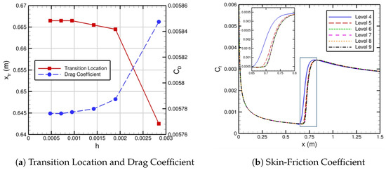 After showing iterative convergence of the automated FUN3D–LASTRAC transition-prediction method for the zero-pressure-gradient flat plate, we focus on grid convergence for the same case. Figure 6 shows the grid convergence of the drag coefficient, transition location, and skin-friction coefficient for this flat-plate case across levels 4 through 9. The level 4 grid has 123,616 points, and the level 9 grid has 4,428,097 points, where the resolution doubles along each spatial direction every other grid level. In Figure 6a, both the drag coefficient and transition location plateau for levels 8 and 9 as the grid spacing parameter approaches zero. The skin-friction distribution also converges as the resolution increases (or the grid spacing decreases) in Figure 6b. Hence, our automated FUN3D–LASTRAC transition-prediction method converges with respect to both the iteration number and grid resolution.