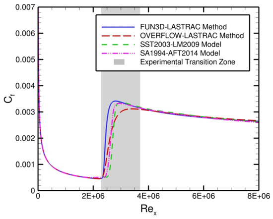 To validate our automated FUN3D–LASTRAC transition-prediction method, we compare the skin-friction distributions between our method, the OVERFLOW–LASTRAC method [29], the SST2003-LM2009 model [5], and the SA1994-AFT2014 model [14] in Figure 7. The experimentally observed transition zone [38] is also included as part of Figure 7 to validate our method. All the different computational skin-friction distributions begin to quickly rise in the experimentally observed transition zone [38], which indicates good agreement between the computations and experiments. The relative agreement between the skin-friction distributions computed with the FUN3D–LASTRAC and OVERFLOW–LASTRAC methods indicates that transition occurs at the exact same value of (the laminar and turbulent skin-friction coefficients also match); the only deviation is limited to the intermittent region between laminar and fully turbulent flow because the coupling methods use different intermittency functions. There is also relatively good agreement between the RANS-based transition models (i.e., SST2003-LM2009 and SA1994-AFT2014) and the automated FUN3D–LASTRAC transition-prediction method in terms of the skin-friction coefficient and the location of transition onset. These successful comparisons provide verification and validation of the FUN3D–LASTRAC approach for modeling transition for this 2D zero-pressure-gradient flat-plate case.