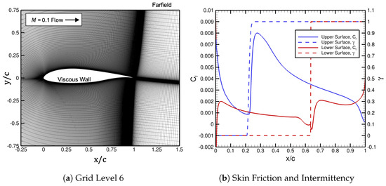 The streamwise distribution of the skin-friction coefficient and the intermittency along the upper and lower surfaces of the NLF-04146 airfoil for the final iteration of the automated FUN3D–LASTRAC method computed on grid level 6 are shown in Figure 8b. The intermittency increases smoothly from 0 to 1 in the regions of boundary-layer transition occurring on the upper and lower surfaces of the NLF-0416 airfoil, while the skin friction also rises sharply in these regions. For the lower airfoil surface, there is negative skin friction within a separation bubble that causes transition, while the boundary layer on the upper airfoil surface undergoes a natural transition.