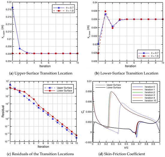 Figure 9 depicts the iterative convergence of the imposed transition locations with the associated residuals and the skin-friction distributions. For the initial basic state, i.e., the zeroth iteration, we imposed transitions at and . Note that this choice is arbitrary, and, if we imposed transition further upstream or downstream on either the upper or lower surfaces for the zeroth iteration, the final converged transition locations would be the same. The skin friction of the initial basic state is shown in Figure 9d. After the initial FUN3D basic state has been obtained, we perform the same iterative procedure conducted for the zero-pressure-gradient flat-plate case and outlined in Figure 1. Both transition locations on the upper and lower surfaces of the NLF-0416 airfoil converge in Figure 9, with values of and . In this case, we consider the flow to be converged at iteration 5 because the associated change in the locations of transition onset for the upper and lower surfaces after iteration 5 is less than m, but we also show convergence to machine zero (i.e., m) or to iteration 15 in Figure 9c. Also, the skin friction in Figure 9d is essentially identical for iterations 4 through 10. The lower under-relaxation factor of 0.7 does not have a significant benefit in this particular case, but, for initially imposed transition locations far away from their converged values and for more complex flow configurations, it helps the automated FUN3D–LASTRAC iterative method to smoothly approach the final solution. The upper-surface transition location converges similarly to the flat-plate case, but the lower-surface transition location has oscillatory convergence because of the strong influence of the separation bubble on transition to turbulence. In other words, for the lower airfoil surface, there is an interaction that occurs between the separation-reattachment characteristics and the location of transition onset. This causes the imposed transition location for the lower surface to be upstream and downstream of the final converged transition location at different iterations of the automated FUN3D–LASTRAC process.