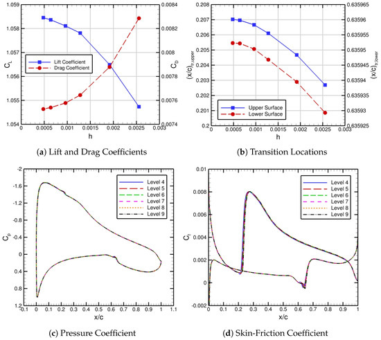 Similar to the flat-plate case, after demonstrating iterative convergence of the automated FUN3D–LASTRAC transition-prediction method for the NLF-0416 airfoil, we focus on showing grid convergence for the case. Figure 11 shows the grid convergence of the lift and drag coefficients, transition locations, and the skin-friction coefficient for the NLF-0416 airfoil via levels 4 through 9. The level 4 grid has 153,265 points, and the level 9 grid has 4,331,777 points. In Figure 11a, the lift and drag coefficients are converging as the grid spacing parameter approaches zero. Both the upper and lower transition locations in Figure 11b also converge with respect to grid resolution. Furthermore, the skin-friction distribution in Figure 11d is also grid-converged by level 9.