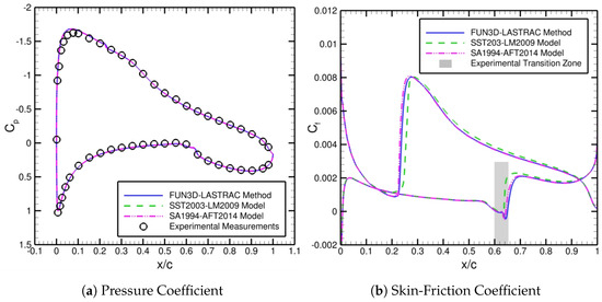 Comparisons of the pressure and skin-friction coefficients from our automated FUN3D–LASTRAC transition-prediction method, the SST2003-LM2009 model, and the SA1994-AFT2014 model. The experimental measurements of the pressure coefficient and the experimental transition zone from Somers [40] are shown as well.