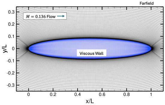 where is the turbulent eddy viscosity, , , is the molecular kinematic viscosity, , is the vorticity magnitude, d is the nearest wall distance, , , , , , and is the intermittency function. The boundary conditions are at the wall and to at the farfield. For the different transitional cases in this paper, we modify the boundary conditions in the farfield such that . This lower value helps to avoid contamination of the laminar boundary layers. Also, the constants are , , , , , , , , , and . For a more complete list of the constants, function definitions, boundary conditions, and limiters, see Ref. [32] or the NASA Turbulence Modeling Resource (https://turbmodels.larc.nasa.gov/, accessed on 20 March 2025).