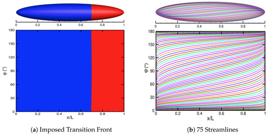 To initiate the automated FUN3D–LASTRAC method, we impose a transition front downstream at . This initial transition front is shown in Figure 14a, where the blue contours indicate a laminar region and the red contours indicate a turbulent region. For the LASTRAC stability analysis, we use 75 vertex seeds on the spheroid surface. The solver-independent module creates the streamlines for stability analysis from these vertex seeds. Figure 14b displays the 75 streamlines on the spheroid surface. We employ under-relaxation by using Equation (7) at each point along the azimuthal or plane with We use the dual – criterion [45,46,47] to determine where transition occurs from the TS and crossflow N-factor values. Refer to Choudhari et al. [2] for more information on calibrating the dual – criterion for multiple aerodynamic configurations. To illustrate the automated transition modeling for a 3D flow configuration, we use the simple criterion . In a real-world application, the criterion would be tuned for a specific facility using a broad range of data. Unlike for the 2D cases, we use point transition or an intermittency zone with zero length, which is a convenient option for 3D cases with mixed-mode transition where intermittency models have not been developed. Figure 15 displays the transition fronts corresponding to iterations 0 through 6 for two different initially imposed transition fronts. Notice that, by iteration 6, the automated FUN3D–LASTRAC method converges for both initial conditions.