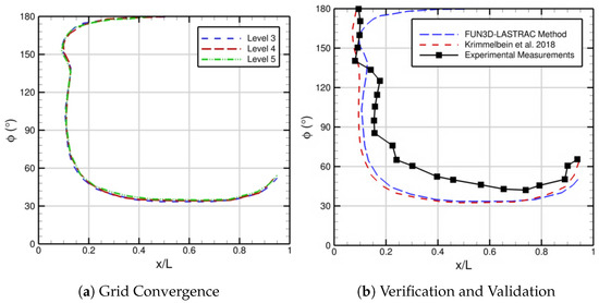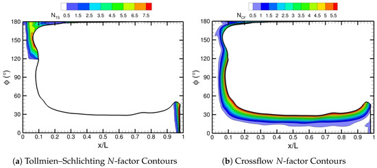 For the final test case, we simulated Mach 0.136 flow over a 6:1 prolate spheroid at an angle of attack equal to twenty-four degrees, where both TS waves and crossflow vortices had significant amplification factors. Thus, we employed a dual N-factor criterion based on PSE () to determine the transition front. The coupled FUN3D–LASTRAC approach converged iteratively using an under-relaxation factor of 0.7. Our analysis revealed distinct transition mechanisms across different regions of the spheroid surface. TS waves dominated for and , while crossflow instability played a dominant role across the intermediate region, . The converged transition front demonstrated insensitivity to changes in the resolution on finer grids. The verification of the FUN3D–LASTRAC coupling approach showed excellent agreement with the transition front predicted by Krimmelbein et al. [44] using a similar approach. A comparison of the predicted transition front with the available measurements also indicated acceptable agreement with the experimental data by Kreplin et al. [41]. These three test cases demonstrate that our automated PSE-based FUN3D–LASTRAC coupling approach reliably predicts transition in viscous flows with good iterative and grid convergence. Future applications across diverse flow configurations should help to refine the N-factor calibrations, advancing the transition modeling capabilities for the design of greener aircraft.