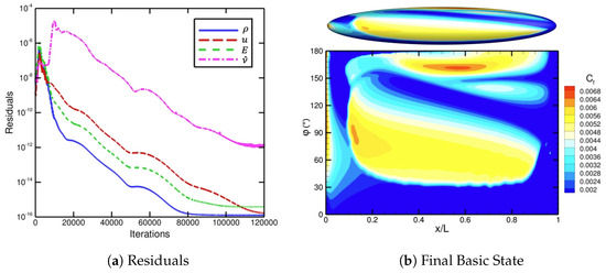 Figure 16 depicts the N-factor contours of TS and crossflow instability from PSE with LASTRAC. The final imposed transition front is also shown in Figure 16, downstream of which the N-factor contours are removed or set to zero because the flow has already transitioned to turbulence. For this case where , the N-factor values associated with TS waves are relatively small and do not significantly influence transition, except for far downstream near and in Figure 16a. Crossflow vortices are important for this angle of attack because the associated N-factor values are appreciably large and are likely to dominate transition for . We show the final solution of the automated FUN3D–LASTRAC method in Figure 17, along with the mean-flow basic-state residuals. Notice in Figure 17a that the mean-flow basic-state residuals drop approximately 10 orders of magnitude to machine zero and level out. The skin-friction contours of the final converged solution in Figure 17b are smooth and match the final transition front in Figure 15. Also, the results in Figure 17b agree with the skin-friction contours in Figure 11d of Krimmelbein et al. [44] for the 6:1 prolate spheroid at , computed using a coupled iterative approach (i.e., SST model [48] with a similar dual N-factor strategy).