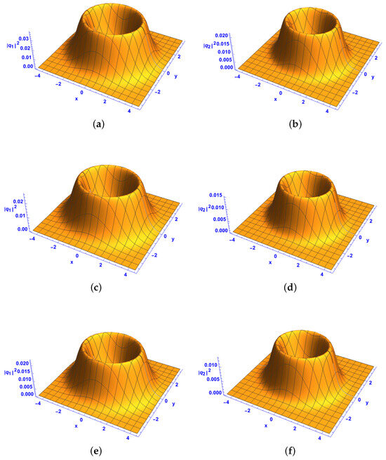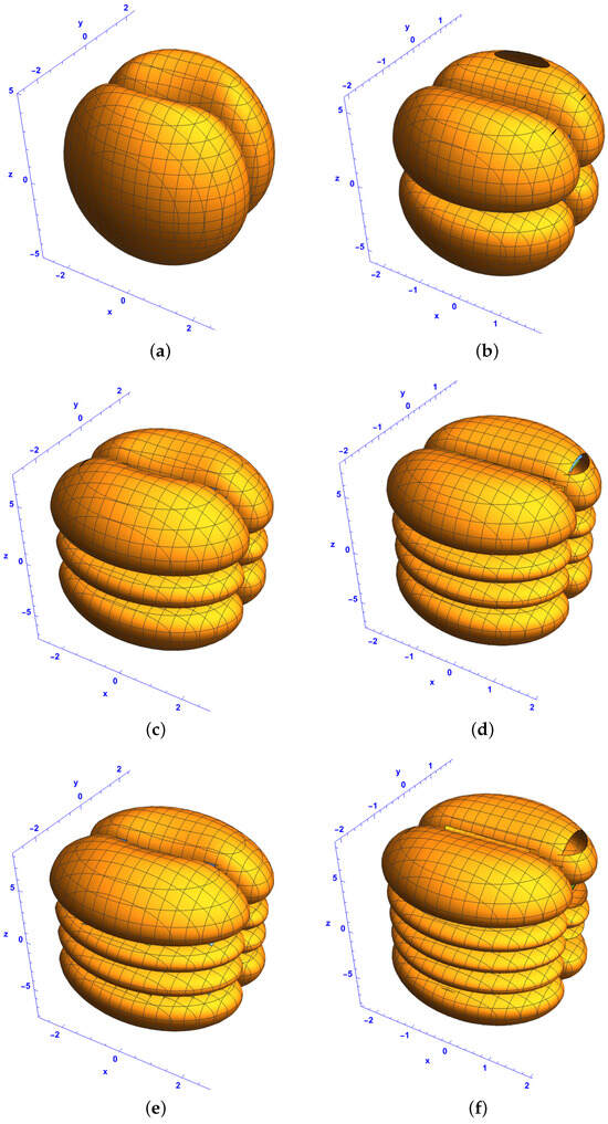 When and , a different family of Gaussian soliton clusters is observed, as shown in Figure 4. For and , Figure 4a and Figure 4b display two ellipsoids symmetrically arranged on either side of the plane and a pair of flat tori, respectively. For and , Figure 4c,d show three ellipsoids symmetrically positioned around the plane and a three-layer flat torus. Finally, for and , Figure 4e and Figure 4f show five ellipsoids arranged in pairs symmetrically distributed on either side of the plane and five flat tori, respectively. When and , a different family of Gaussian soliton clusters is depicted in Figure 5. For and , Figure 5a and Figure 5b show a pair of ellipsoids and two pairs of ellipsoids symmetrically arranged on either side of the plane , respectively. For and , Figure 5c,d show three ellipsoids arranged in pairs and four ellipsoids arranged in pairs symmetrically positioned around the plane . For and , Figure 5e and Figure 5f show four ellipsoids arranged in pairs and five ellipsoids arranged in pairs symmetrically distributed on either side of the plane , respectively. Figure 3a,b show a hollow cylinder and a pair of flat tori for and . Figure 3c,d show a three-layer and a four-layer flat torus for and . Figure 3e,f show four-layer and five-layer flat tori for and . The transition from a ring-like structure (as shown in Figure 3) to ellipsoidal clusters suggests a reconfiguration of soliton interactions due to the change in the parameter l. The presence of multiple ellipsoid structures highlights strong localization effects, which play a crucial role in the formation of extreme wave patterns. Unlike the flat torus structures in Figure 3 and Figure 4, Figure 5 emphasizes the ellipsoidal formations that emerge due to changes in q. The shift from ring-like solitons to clustered soliton pairs reflects how parameter variations impact wave coherence and stability.