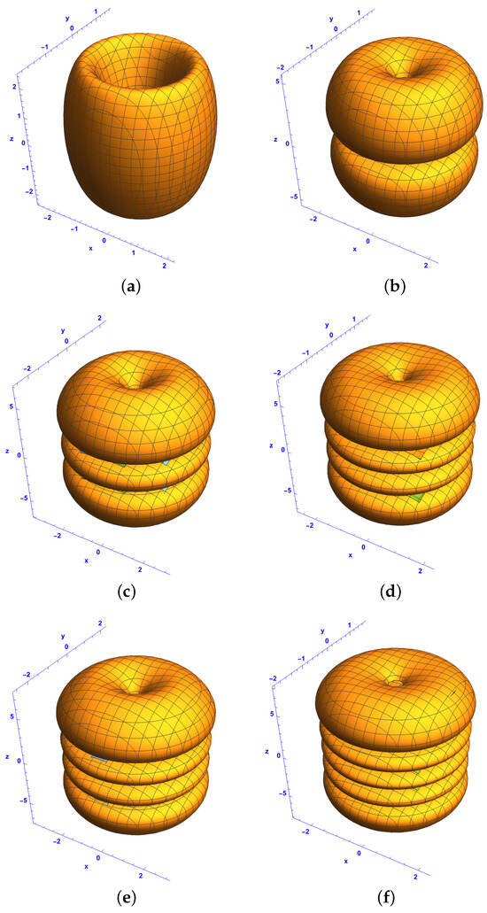 We can explore some localized structures by varying l and q. For and , Gaussian soliton clusters can be formed, as shown in Figure 3. Notably, increasing the Hermite parameters p and n adds layers to these soliton clusters along the z-axis. The number of layers in the z-direction is given by and , as illustrated in Figure 3a–f. In Figure 3a,c,e, the isosurface component is depicted, while Figure 3b,d,f show the isosurface component . These multipole patterns reveal symmetric structures: a hollow cylinder and a pair of flat tori appear in Figure 3a and Figure 3b for and respectively. A three-layer and a four-layer flat torus are shown in Figure 3c and Figure 3d for and , respectively, while a four-layer and a five-layer flat torus are illustrated in Figure 1f and Figure 3e for and , respectively.