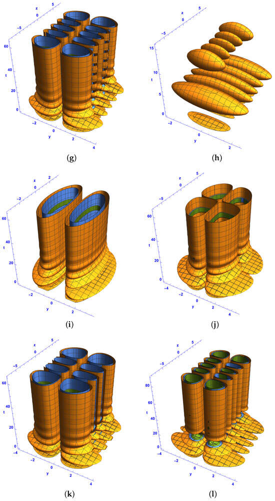 Figure 10 and Figure 11 extend our previous results by exploring soliton evolution in the yzt-spacetime domain. The number of soliton layers increases with p and n, while higher leads to soliton contraction over time. Figure 10 demonstrates asymmetric soliton behavior due to complex coefficients, whereas Figure 11 shows more structured soliton formations when real coefficients are used.