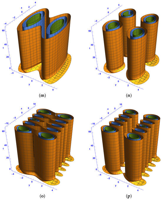 Increasing p and n leads to a greater number of soliton layers along the z-axis. This aligns with previous observations from Figure 1, Figure 2, Figure 3, Figure 4, Figure 5, Figure 6, Figure 7, Figure 8 and Figure 9, where the number of soliton layers was determined by and . For example, in Figure 10a,b, where , and , a single-layer bright–bright soliton structure is observed. As p and n increase in Figure 10c,d (p = 3, n = 4), multiple layers emerge, forming a more complex soliton pattern.