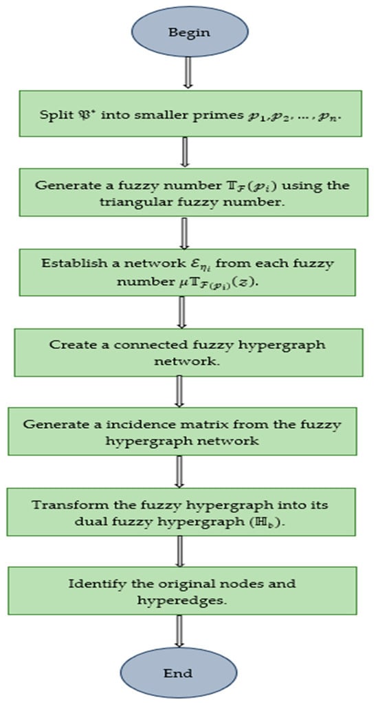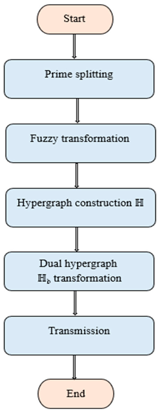 | Input: Secret key (a large prime number). Output: The dual fuzzy hypergraph and metadata are prepared for transmission. Begin Step-1: Split into smaller primes ,, such that +. Step-2: For each prime generate a fuzzy number using the triangular fuzzy number conversion. Step-3: Each fuzzy number is splitted as nodes of a hyperedge in a fuzzy hypergraph (. Step-4: Establish a network from each fuzzy number Step-5: Develop a connected network with nodes values as with respective hyperedges . Step-6: Create a fuzzy hypergraph network, where the values of the nodes in the shared network can be interpreted as a contribution to each network it belongs to. Step-7: Generate an incidence matrix from the fuzzy hypergraph network, representing the relationships between nodes and hyperedges. Step-8: Transform the fuzzy hypergraph into its dual fuzzy hypergraph (. Step-9: Add simulated nodes and hyperedges to the dual fuzzy hypergraph to make the structure more complex and obscure. Step-10: Identify the original nodes and hyperedges . End |