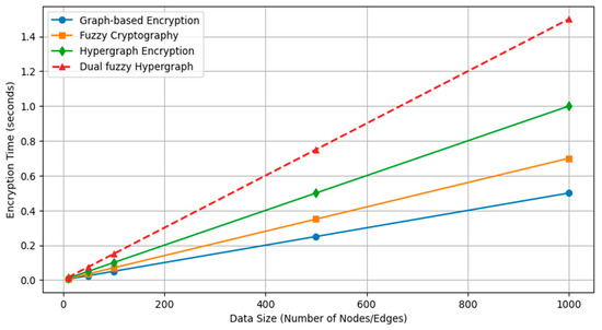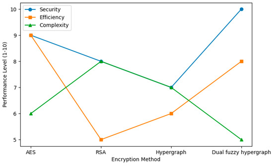 The graph below, in Figure 5, offers a detailed comparison of different encryption methods based on their efficiency, security level, and computational complexity. The compared algorithms are Advanced Encryption Standard (AES), Data Encryption Standard (DES), Rivest–Shamir–Adleman (RSA), and the suggested fuzzy hypergraph-based encryption scheme. The comparison reveals the merits and demerits of each method and how the suggested technique provides the best balance between security and performance.