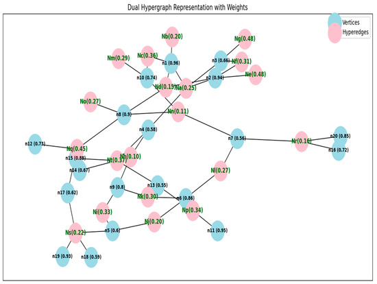 To transform a fuzzy hypergraph into its dual, compute the transpose of the incidence matrix, where the roles of nodes and edges are swapped. The dual representation, as shown in Figure 4, now containing the scrambled and obfuscated information, is transmitted as the encrypted message. The nodes are represented as and hyperedges as Simulated nodes and edges are added to the network to make is more complex. The nodes and hyperedges are swapped, with , , , …, swapped to and , ,… to