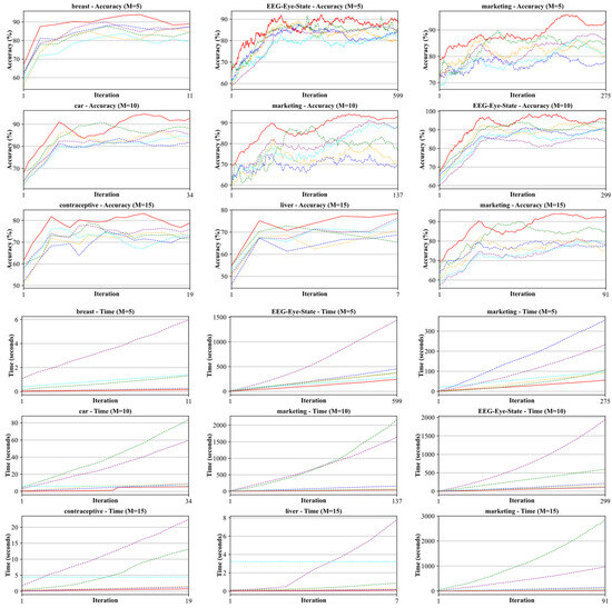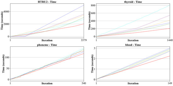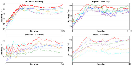 Compared to conventional online learning algorithms, O-DIA-TSK achieved better prediction results with lower computational resource consumption and shorter update cycles when handling complex data streams, ensuring the stability and accuracy of the model. The classification accuracy of each method in Figure 1 reflects the more significant changes in DIA-TSK when compared to the other methods, as the trend of online sample iteration continues. This means that DIA-TSK is more sensitive to newly added samples. This is because DIA-TSK always ensures that the classifier parameters are optimal for the learned samples, while the comparative methods supplement the classification error of the existing structure with respect to the new samples and newly added parts into the classifier structure. When concept drift occurs, the comparative algorithms—including FM3, LASVMG, OnlineSVM (Markov), ILDA (sequential) and OSELM (sequential)—had difficulty fully describing the new data distribution without successfully detecting concept drift. In particular, when carried out on the data set thyroid, due to concept drift, the classification performance of LASVMG, OnlineSVM (Markov), FM3 and ILDA (sequential) declined significantly, while the proposed O-DIA-TSK still presented superior classification accuracy.