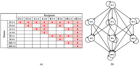 On the basis of Landsteiner and Wiener’s discoveries, the following well-known blood compatibility chart has been devised and widely used (Figure 1a). The highlighted table cells indicate the possible blood transfusions from blood donors (rows) to blood recipients (columns): depending on the presence or absence of the respective three antigens, a transfusion is or is not permissible (safe). The same relations are graphically represented as a directed graph (Figure 1b).