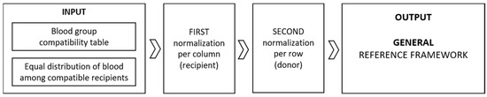 In our mathematical model, among all possible normalization techniques, sum normalization is the appropriate one as for each recipient’s blood type, as it determines all possible transfusion options (respectively compatible blood types), aggregates them, and takes the relative share for each match.